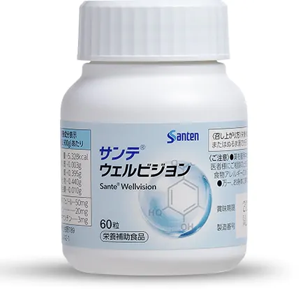 ウェルビジョンは目などのエイジングに着目したサプリメントです。2粒にルテイン20mgとヒシ果皮ポリフェノール50mgを配合しています。体内で合成できない成分であるため、日々の食事を通じて摂取することが大切です。